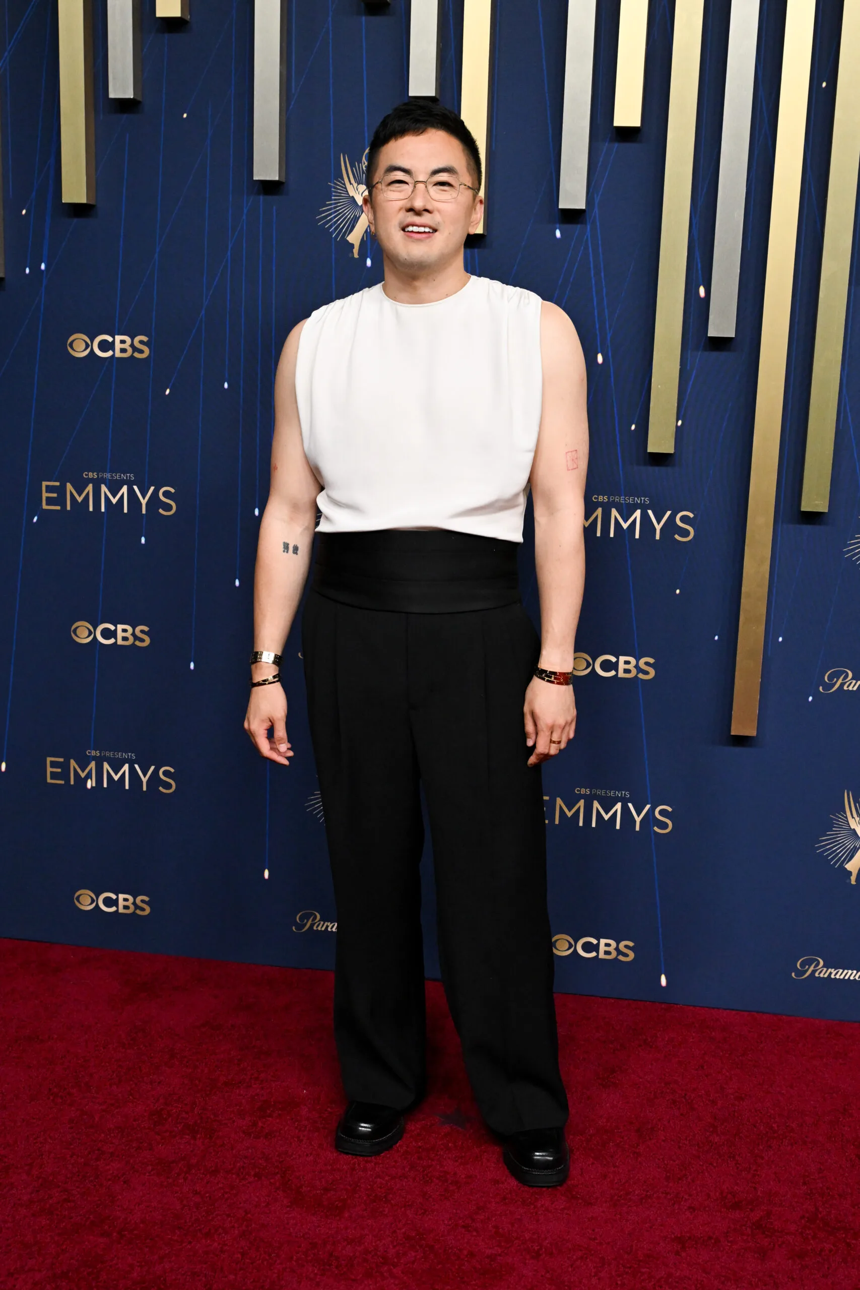 Always the best dressed on late night TV, Bowen Yang looked sharp in a sleek monochrome sleeveless look complete with edgy boots and cummerbund.