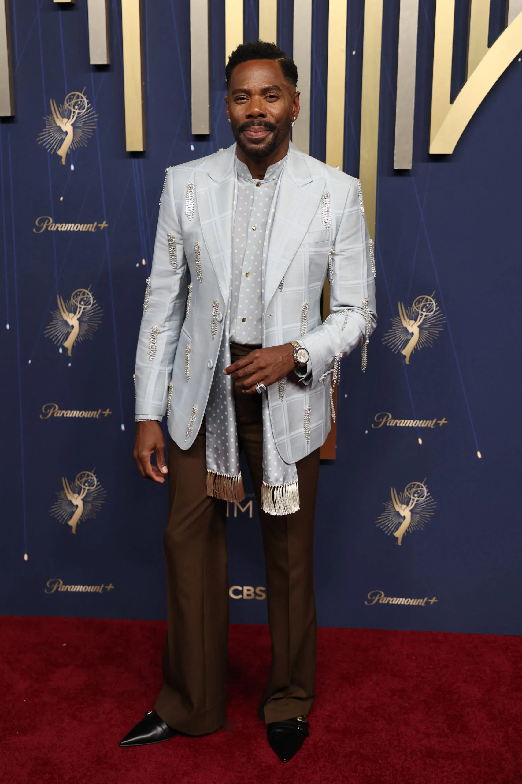 Always dapper, Colman stunned in a powder-blue Valentino suit with crystal embroidery, refined , bold and unapologetically stylish.