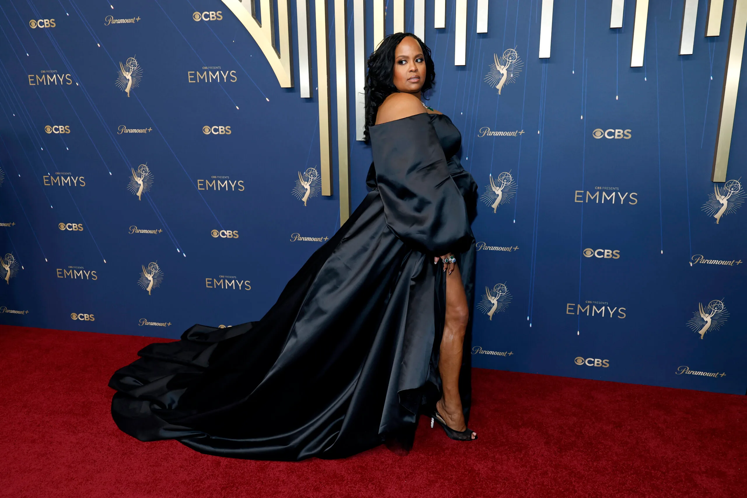 Actress Natasha Rothwell glided in a dramtic off-the-shoulder black floor sweeping gown with a hint of leg by Ines Di Santo.