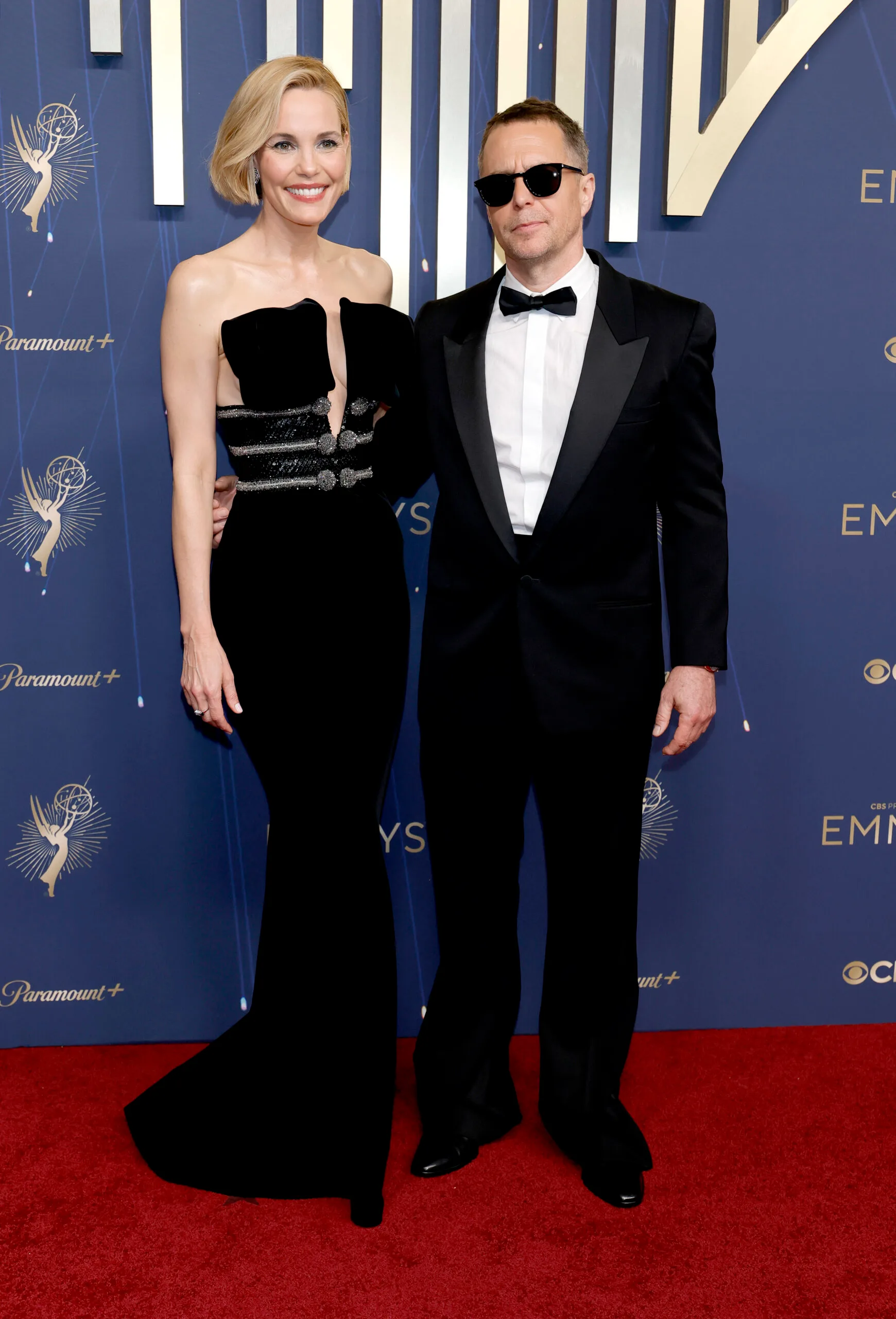 Leslie Bibb stunned in a sculptural black velvet Armani Privé gown with plunging sweetheart neckline and beaded detailing, matched by husband and co-star Sam in a coordinating black tuxedo.