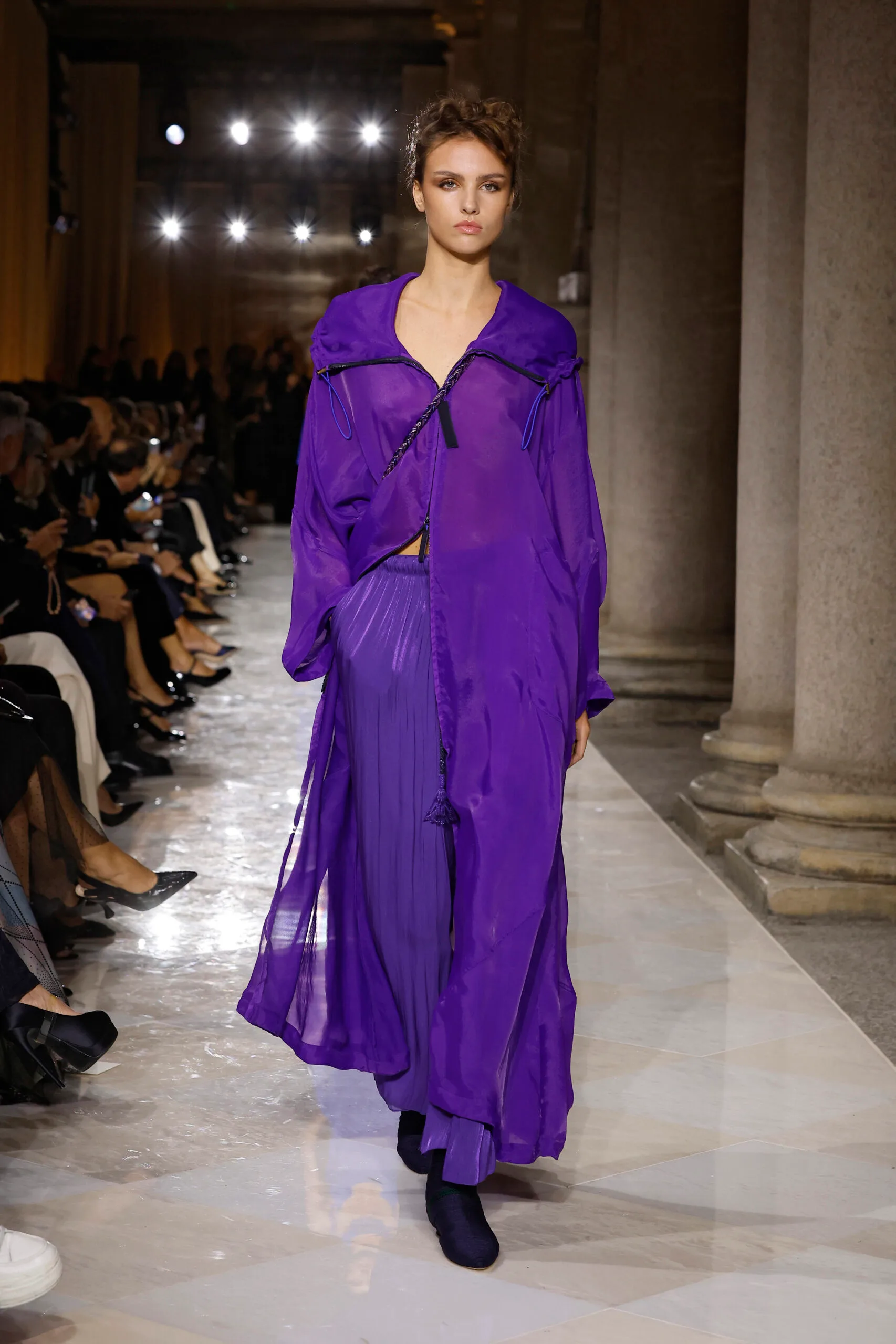 The show opened with a whisper rather than a shout: diaphanous blouses paired with fluid trousers, jackets softened by curved lines, and a palette that transitioned seamlessly from hushed neutrals to glimmers of soft metallics. Fabrics floated, catching the light as if weightless, while delicate embroidery shimmered across gowns that felt less like statements and more like memories being woven in real time. Each look carried Armani’s signature – purity of line, quiet luxury, and a refusal to bend to passing trends.