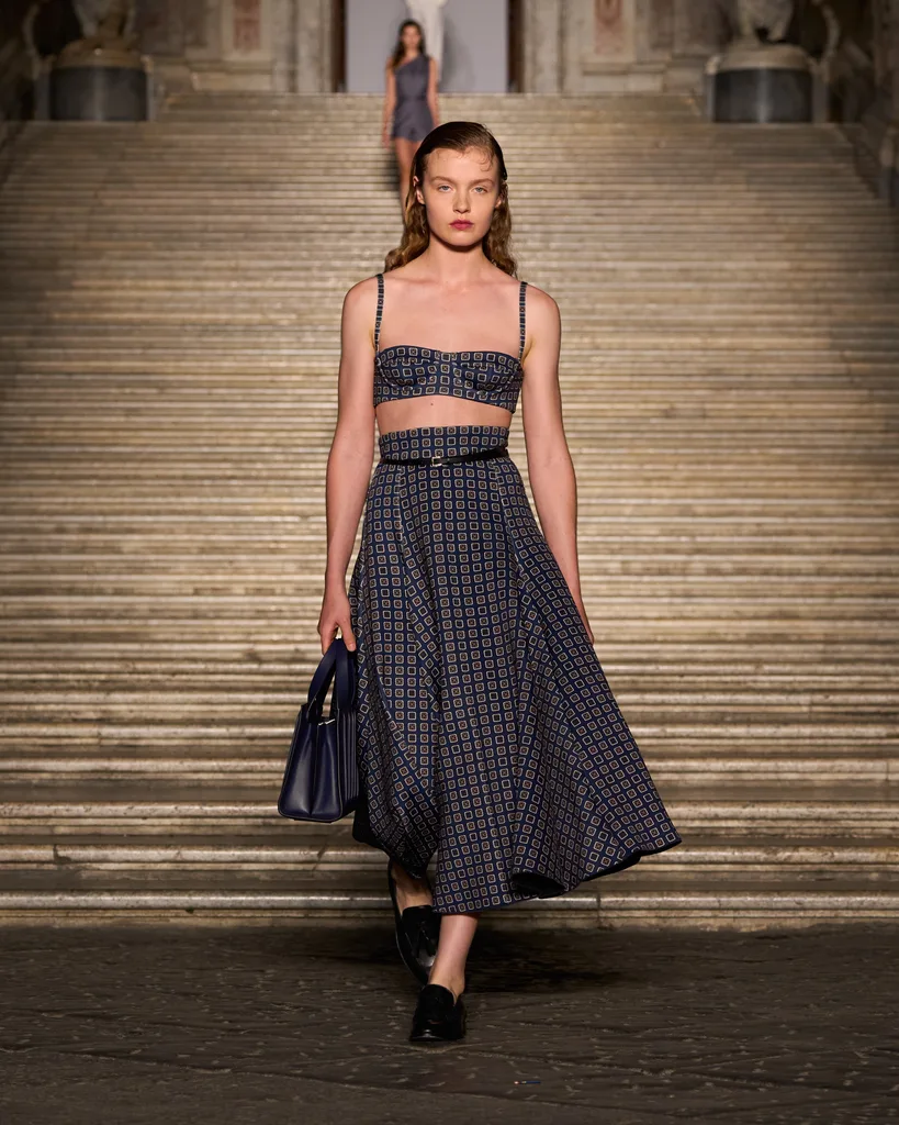 The collection’s highlights include monogrammed silk pajamas, delicate embroidered cashmere sweaters, and striped shirts in soft pinks and blues with crisp collars and cuffs. Jackets adopt a lighter construction, drawing from Neapolitan tailoring, while audaciously rolled shorts and full-circle skirts with geometric pockets inject a playful edge. Signature cravat-print designs, first seen in 1951, make a stylish comeback, while strapless dresses, tops with portrait collars, and matching bras nod to Max Mara’s enduring commitment to elegance with intention.