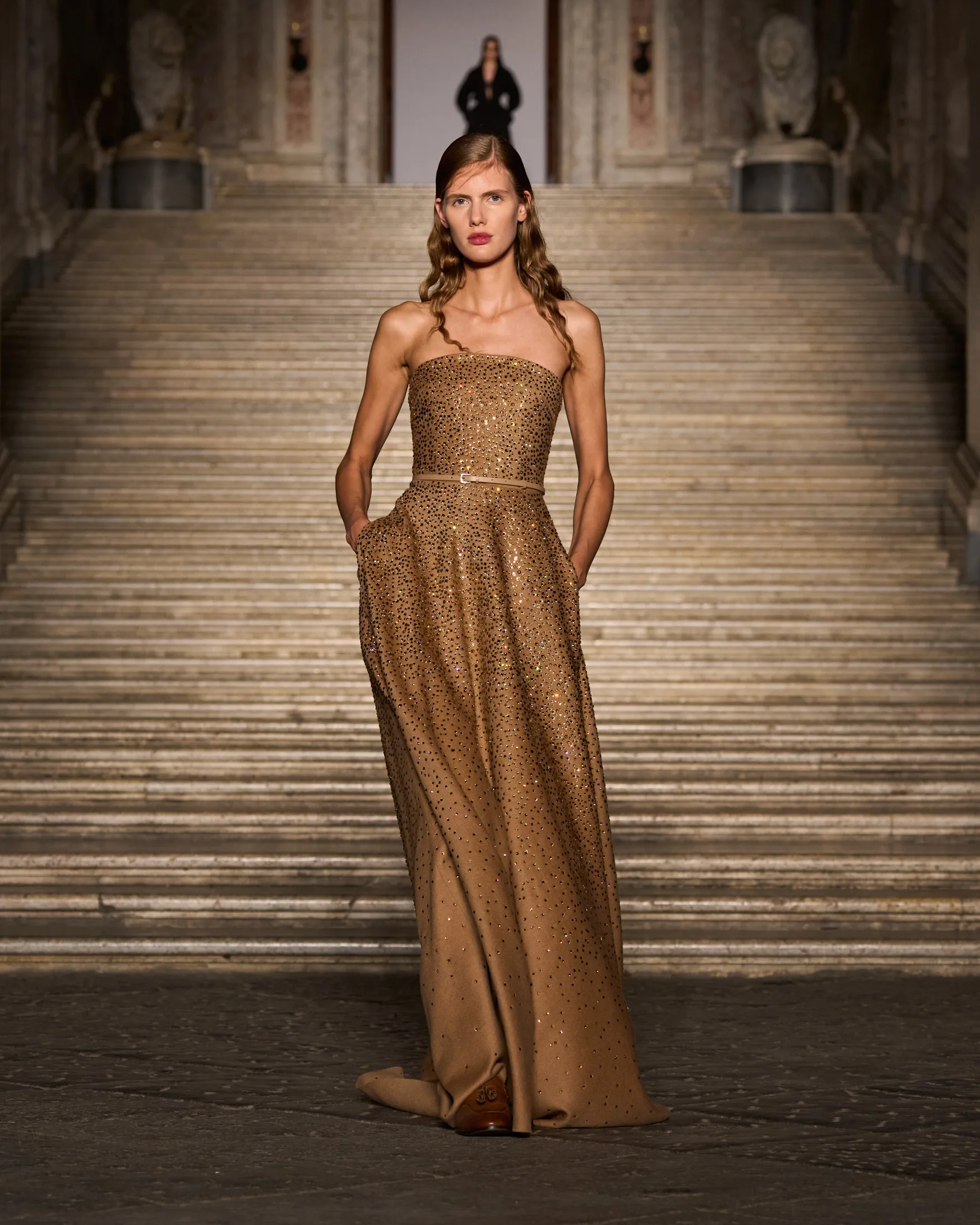 Outerwear is unapologetically timeless. Belts, shawl-collared coats, funnel-necked jackets, and fringe-detailed pieces ensure the line transitions effortlessly from day to evening, while strapless gowns, adorned with crystal detailing and silk gauze, feel simultaneously sculpted and ethereal. The collection is Italian in its essence — designed to look good, feel strong, and move seamlessly through life’s moments.