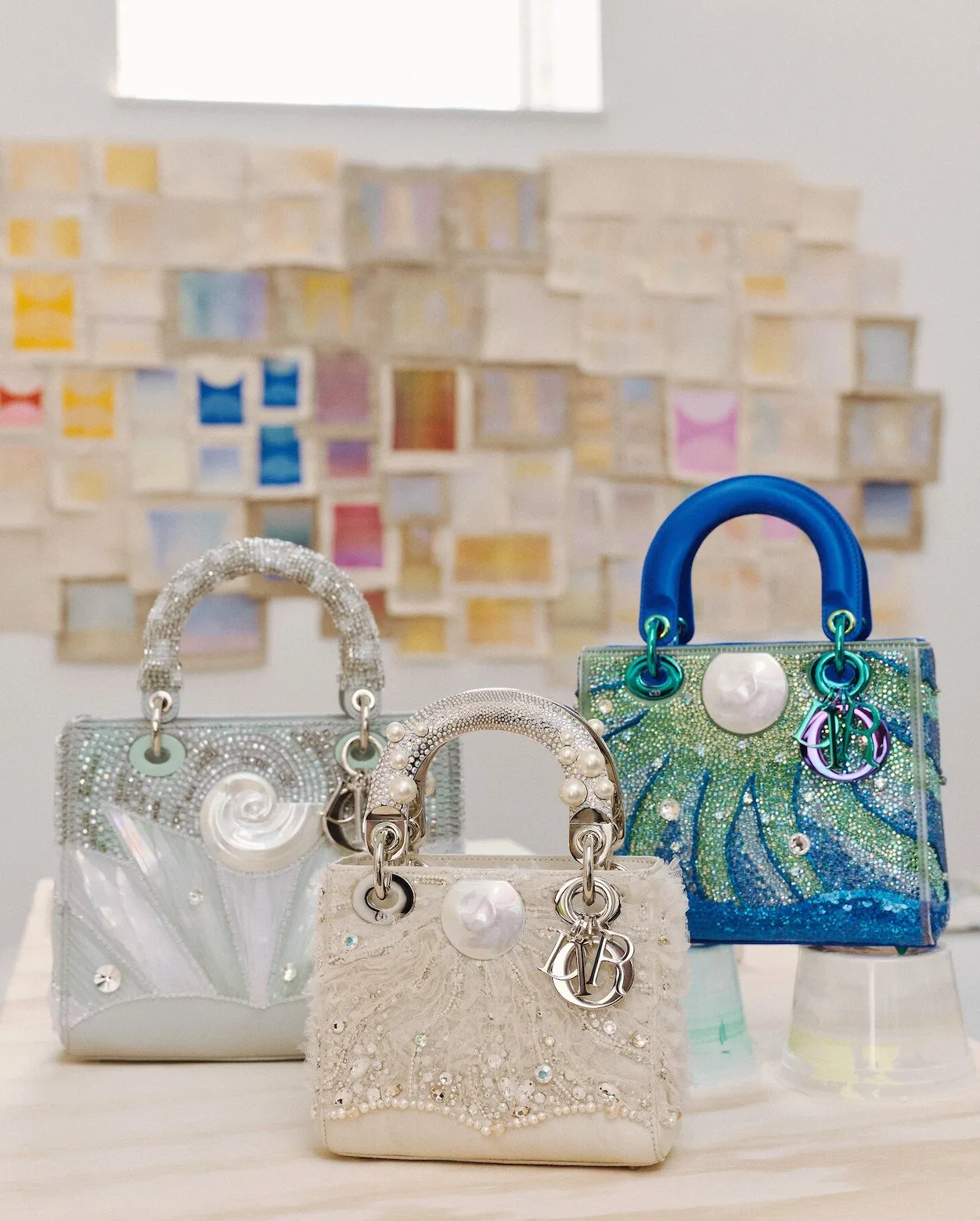 Known for her ethereal studies of light and spiritual landscapes, Brooklyn-born painter Jessica Cannon brings a celestial vision to life across three luminous interpretations of the Lady Dior that seem to shimmer between sea and space. Each bag orbits around a glowing focal point – a sculpted sun, moon or planet – rendered in mother-of-pearl and surrounded by delicate beadwork that mimics the rhythm of waves. On one, muted pastels meet flashes of acid blue and iridescent green, giving the piece a vibrant aquatic energy. On another, a pearlescent shell spiral unfurls into lustrous crystals, with all displaying an incredibly intricate level of craftsmanship.