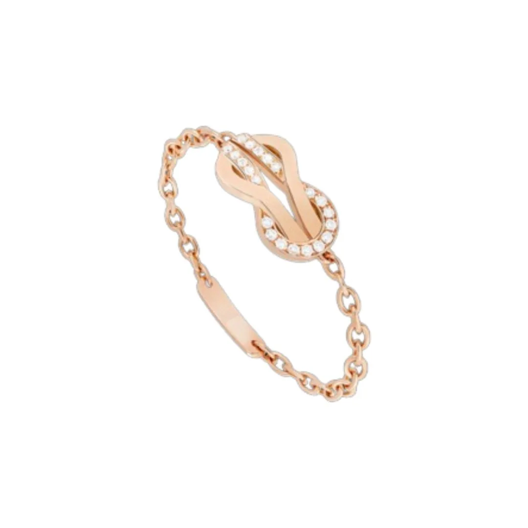 The Chance Infinie chain ring is crafted in 18k pink gold and set with 21 brilliant-cut diamonds in a subtle half-pavé design, offering a refined, everyday take on the infinity motif.