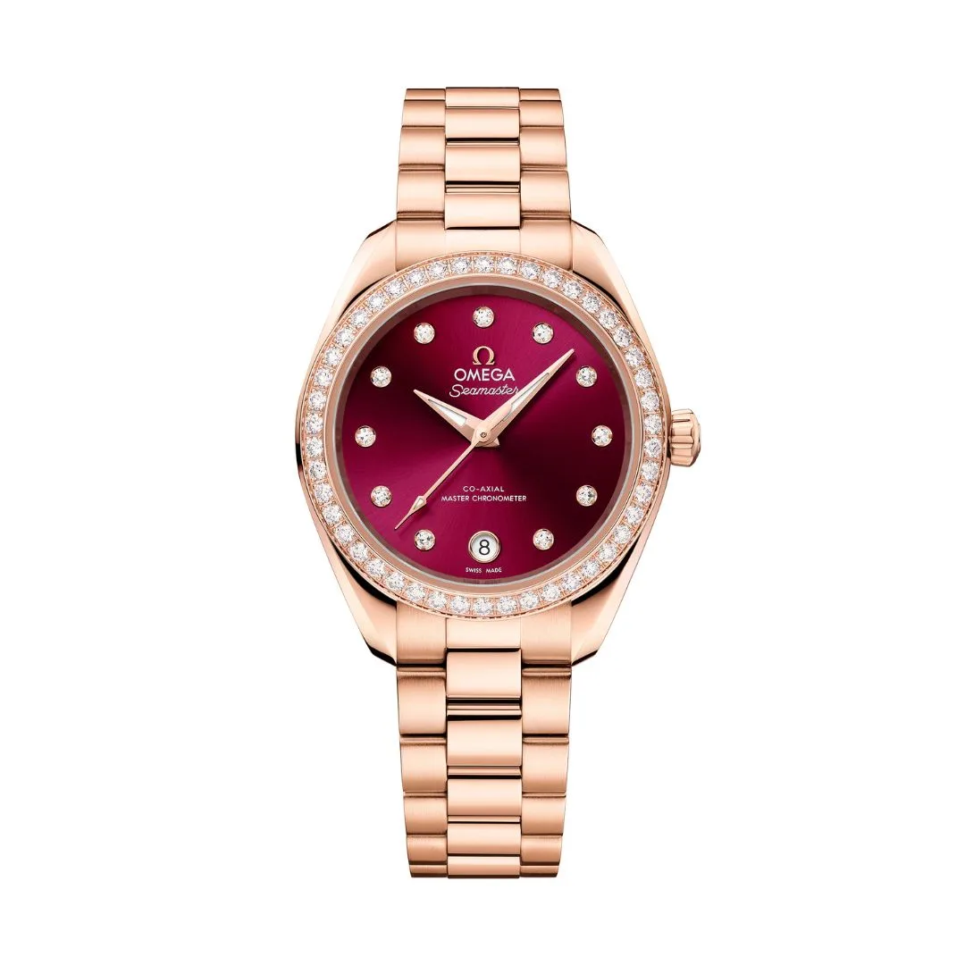 The 30 mm Seamaster Aqua Terra in 18K Sedna Gold features a diamond-set bezel, burgundy sun-brushed dial, and OMEGA’s Co-Axial Master Chronometer Calibre 8751, combining maritime heritage with refined elegance.