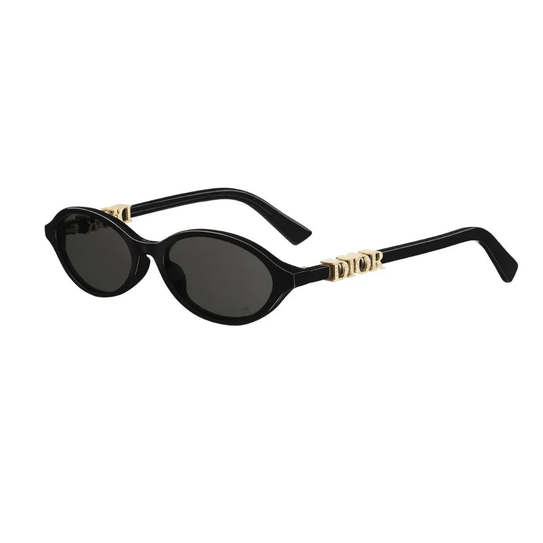 The DiorTreasure sunglasses reimagine the low oval silhouette with a modern, sculptural edge. Their glossy black acetate frame is elevated by a gold-finish Dior signature embellished with white Swarovski® crystals, bringing a touch of quiet opulence to the design. Paired with deep grey lenses, this sleek, luminous style adds an effortless layer of sophistication to any ensemble.