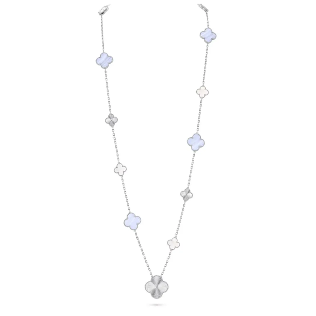 Van Cleef & Arpels’ Magic Alhambra collection reimagines its iconic symbol of luck with dynamic, asymmetrical motifs and new transformable long necklaces. This year’s pieces contrast rose gold with luminous mother-of-pearl or pair chalcedony with white gold, while guilloché detailing and the signature beaded contour heighten radiance and sculptural allure.