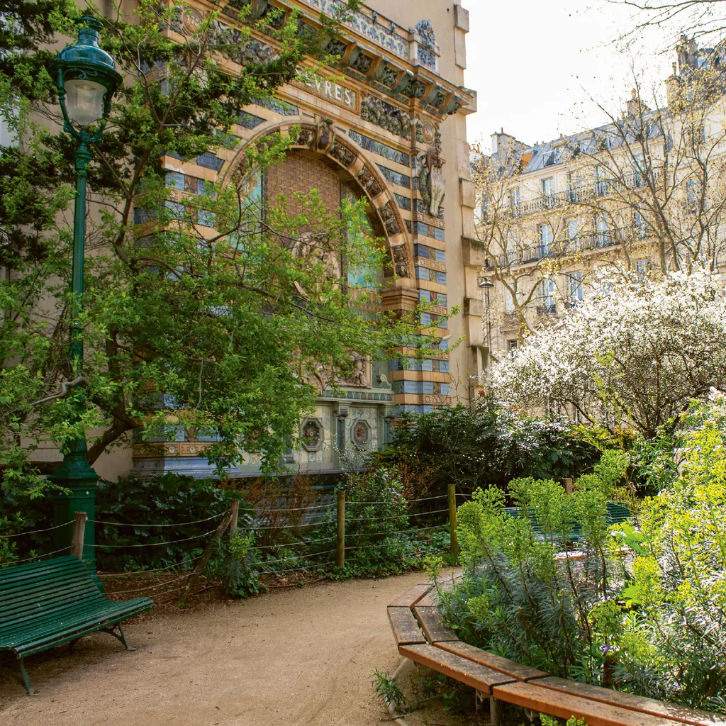 This tiny garden packs quite a punch. Among the lush and shady summer greenery, its most famous feature is the art nouveau arch: 12 metres high and 10 wide, it was built for the 1900 Paris Exposition to showcase the skill of the ceramic workshops of the Manufacture Nationale de Sèvres. After the exposition closed, it was installed in the square in 1905.