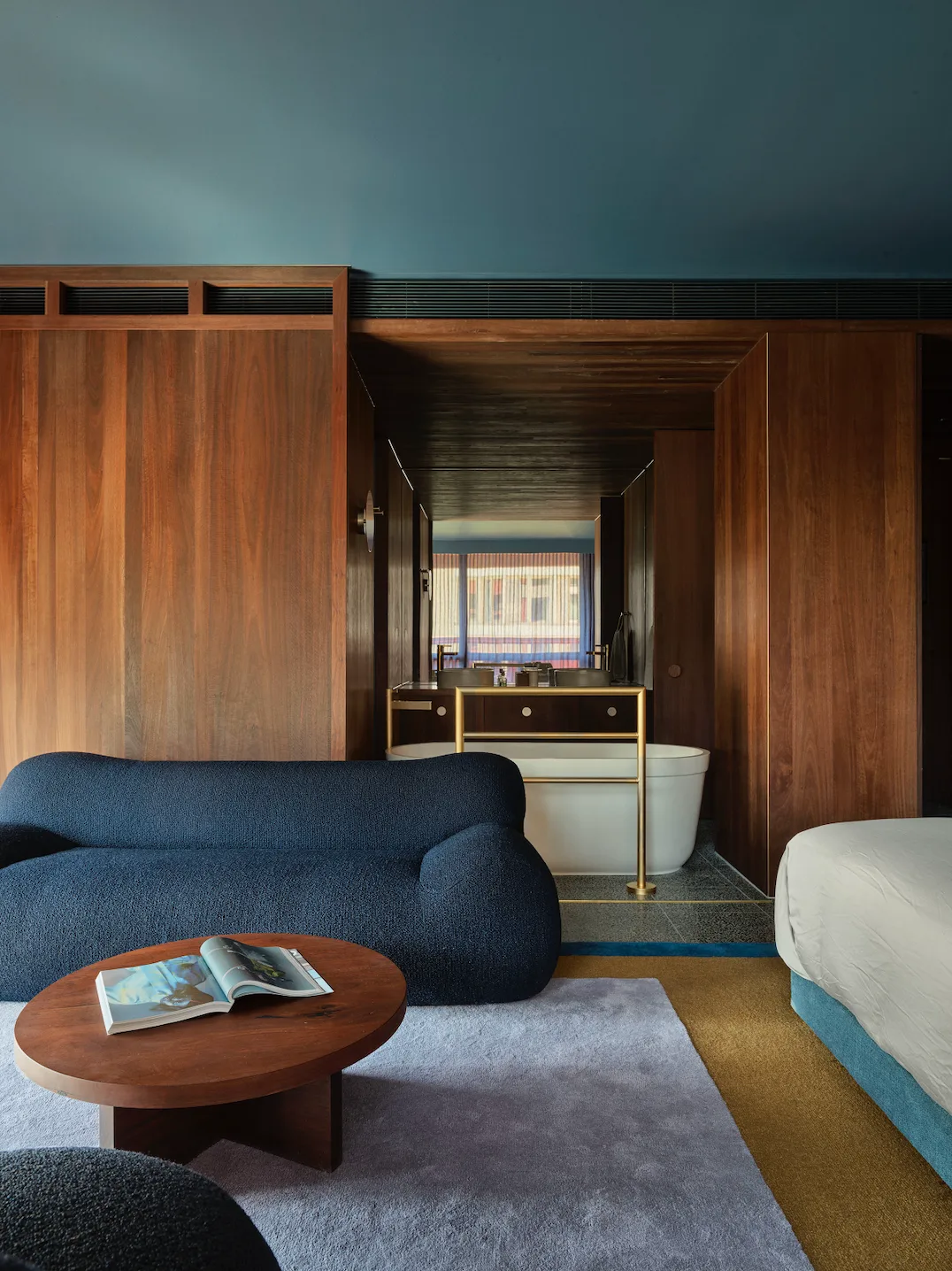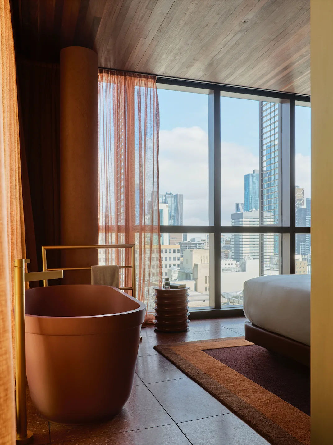 Inside, the hotel features 191 rooms and suites, each adorned with a warm palette of magenta, indigo, and green, complemented by Jarrah wood furnishings. The rooms are designed to offer a chic and calming retreat amidst the bustling city, with amenities like oversized soak tubs (yes, please) and custom-designed furniture by local artisans. It’s all very cool (this is Melbourne, after all).